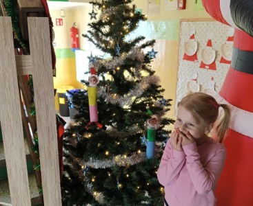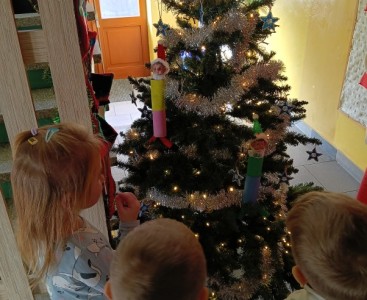 Po powrocie ze spaceru zauważyliśmy, że nasze Elfy zniknęły z sali. Szukaliśmy ich wszędzie i nie uwierzycie gdzie je w końcu znaleźliśmy... na choince w korytarzu!!! I na dodatek pochowały się w rolki papierowe, ale oczywiście nie takie zwykłe szare, tylko sobie je pomalowały farbkami. Szalone te nasze Elfy :)