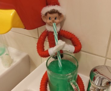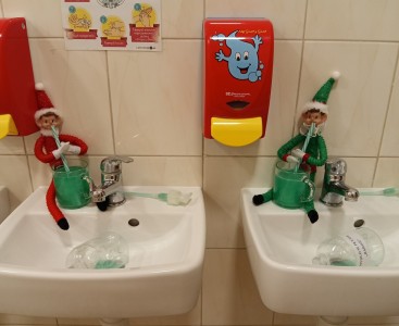 Gdy przyszliśmy rano do przedszkola nie zastaliśmy Elfów w naszej sali.. Po długich poszukiwaniach odnalazły się w naszej łazience. Siedziały sobie wygodnie na umywalkach i piły przez słomkę mydło w płynie!!! Niewiarygodne jakie pomysły przychodzą im do głowy. Przecież nawet najmłodsze przedszkolaki wiedzą, że mydła nie można pić!!! Ciekawe czy będą potem puszczać bańki mydlane :)