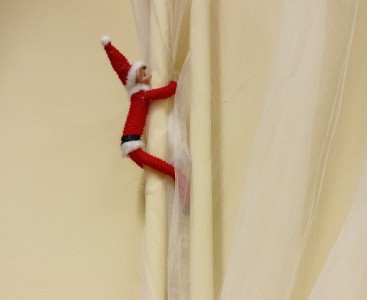 Nasze Elfy dzisiaj nie napsociły za wiele, bo jeden z nich - Psotnik, zmęczył się wczorajszymi figlami i urządził sobie sypialnię w pudełku z chusteczkami. Za to Rozrabiaczek pełen zapału postanowił wspiąć się na karnisz, ale na szczęście zdążyliśmy go powstrzymać. Nie wiadomo co by wymyślił będąc tak wysoko....