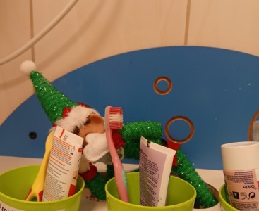 Nie uwierzycie, ale nasze Elfy napsociły drugi raz w tym dniu!!! Tym razem zrobiły nam bałagan w łazience. Psotnik przestawił na półkę Motylków wszystkie nasze kubki ze szczoteczkami do zębów, a Rozrabiaczek owinął się papierem toaletowym w jednej kabinie. Cóż to za szalone elfy!!! Ciekawe co jutro zastaniemy w przedszkolu?!