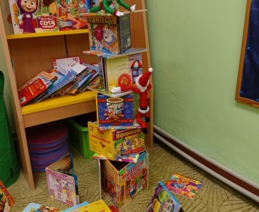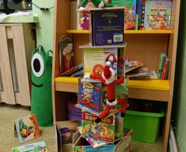 Co zastaliśmy dzisiaj rano w naszej sali? Wieżę z książeczek i Elfy psotniki wspinające się do góry. Cóż za pomysły wpadają im do głów?! Oczywiście wszystkie książeczki musieliśmy sami poukładać na regale, bo Elfy poszły odpoczywać na parapet. Zapewne wymyślają już nowe psoty....