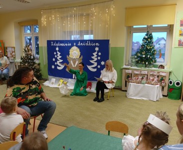 Tegoroczne spotkanie przedświąteczne odbyło się w formie warsztatów, w których udział wzięli rodzice naszych Żabek. Tematem przewodnim była opowieść o małym psotnym Aniołku, który musiał zejść na ziemię czynić dobre uczynki, żeby stać się lepszym i wrócić do nieba. Pomagał Mikołajowi ozdabiać i rozwozić choinki do wszystkich domów, a gdy już zabrakło ozdób oddał gwiazdki ze swojej sukienki i ściął anielskie złote włosy, aby uszczęśliwić biedne dzieci. Podczas naszych warsztatów dzieci i rodzice musieli wykonać ozdoby na naszą choinkę oraz gwiazdeczki na sukienkę Aniołka. Dzieci zaśpiewały świąteczne piosenki i zatańczyły wokół choinki. Na koniec odbył się kiermasz pierniczków własnoręcznie dekorowanych przez nasze Żabki.