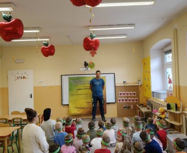 Dziś w naszym przedszkolu obchodziliśmy Dzień Jabłka – święto, które pozwoliło dzieciom poznać tajemnice tego zdrowego i pysznego owocu. Na początku spotkaliśmy się z sadownikiem panem Piotrem Pencko, który w ciekawy sposób opowiedział dzieciom o pracy w sadzie, odmianach jabłek i o tym, jak dbać o drzewa owocowe. Maluchy mogły zadawać pytania i dowiedziały się, dlaczego warto jeść jabłka każdego dnia.