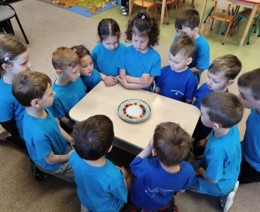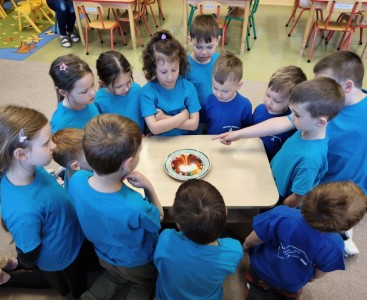 Po części teoretycznej przyszedł czas na praktyczne działania i zabawę. Dzieci brały udział w eksperymentach z kolorową wodą, za pomocą pipetek barwiły waciki i obserwowały eksperyment „tęcza na talerzu”.
