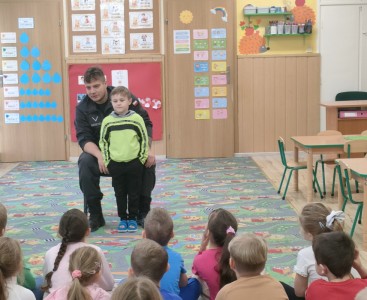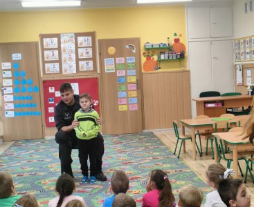 Podczas spotkania dzieci dowiedziały się, na czym polega praca funkcjonariusza oraz jakie zadania wykonują psy służbowe. Przedszkolaki z ogromnym zainteresowaniem obserwowały pokaz posłuszeństwa i umiejętności Lupo.