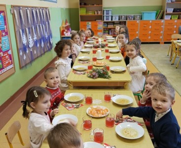 Dzisiaj zasiedliśmy wspólnie z paniami oraz naszymi koleżankami i kolegami z grupy Żabki do świątecznego stołu. Podzieliliśmy się opłatkiem składając sobie świąteczne życzenia i spożyliśmy wigilijny obiad. Po części głównej były również przekąski i czas na rozmowy oraz śpiewanie kolęd. Był to miły przedsmak zbliżających się Świąt Bożego Narodzenia.