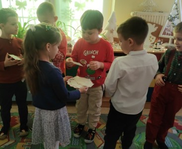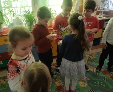 W naszej grupie odbyła się uroczysta Wigilia. Dzieci przypomniały sobie tradycje świąteczne związane z Bożym Narodzeniem. Wspólnie podzieliliśmy się opłatkiem, złożyliśmy sobie serdeczne życzenia oraz zjedliśmy wigilijny obiad. Następnie dzieci z radością częstowały się słodkościami przyniesionymi przez rodziców. Spotkanie upłynęło w miłej, ciepłej i świątecznej atmosferze.