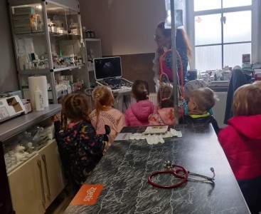 Wizyta u weterynarza dostarczyła nam wiele radości i nowej wiedzy. Pani Klaudia opowiedziała nam jak przebiega wizyta piesków i kotków w ich gabinecie.