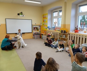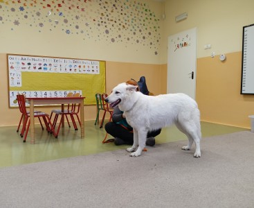 W dniu dzisiejszym po raz drugi gościliśmy w naszym przedszkolu psiego terapeutę. Tym razem Pani Sylwia przyjechała do nas z suczką o imieniu Super, rasy biały owczarek szwajcarski. Super pokazała dzieciom kilka sztuczek i mogliśmy przygotować dla niej węchowe zagadki. Przypomnieliśmy sobie zasady podchodzenia do psów i miejsca, w których można pieska dotykać. Każde dziecko miało okazję podejść i pogłaskać Super. I to właśnie było SUPER fajne ;)