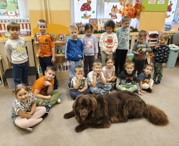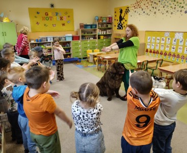 W naszym przedszkolu odbyły się zajęcia z dogoterapii z udziałem psa rasy nowofundland, tzw. wodołaza. Ten duży, spokojny i niezwykle przyjazny pies szybko zyskał sympatię wszystkich przedszkolaków.